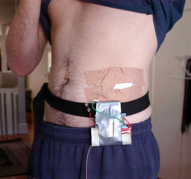 Para conectar el dispositivo a ti mismo simplemente correa en el cinturón alrededor de su cintura y cinta en la placa del cuerpo usando cinta de fleje (usted podría incorporar la placa en el cinturón pero grabando a sí mismo se asegura que no viene apagado o te choque debido a una conexión suelta).