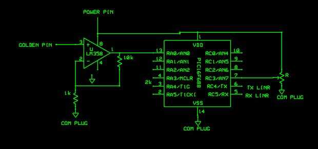 El amplificador operacional está configurado como amplificador de voltaje de x 11 de la espiga de oro. Usé un amplificador ya que el pin sólo da 200mV en plena señal de voltaje DC. El amplificador alimenta AN0 del pic. La olla no va a AN7 amp necesitada y ganchos para la misma potencia que el PIC y el OP AMP