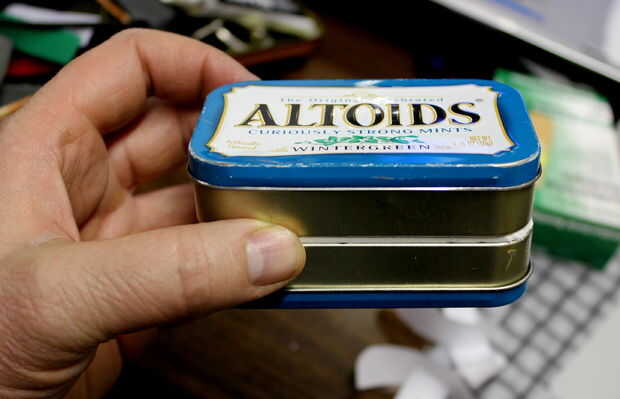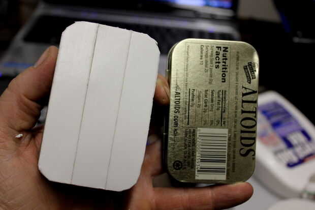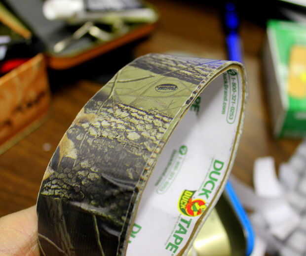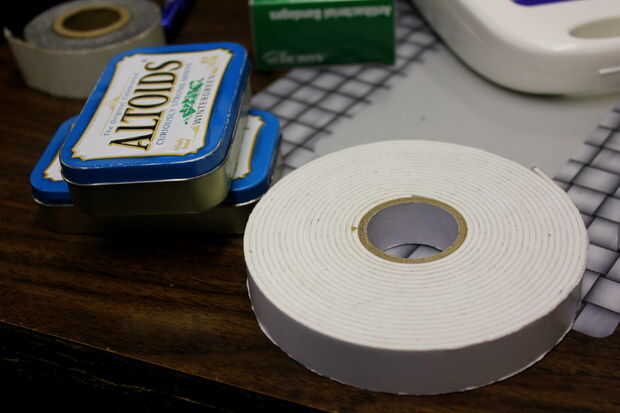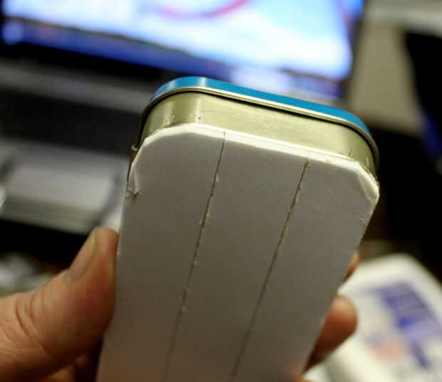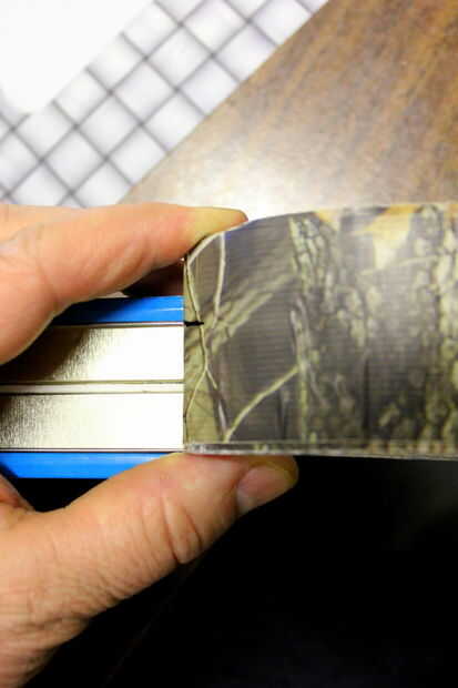 Prensa de cinta adhesiva en un lado de una lata dejando a un lado de la cinta con papel todavía atado por lo que es costumbre obtener suciedad o materia en la espuma. Proyección de cinta un poco sobre los bordes de las latas y luego recortar con un cuchillo del exacto o tijeras.