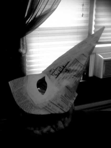 Esta es una máscara del doctor peste hice de cartulina. Lo siento pero no hace cualquier trabajo en curso fotos: dibujó el perfil lateral en dos hojas de cartulina y recórtalo. He utilizado trocitos doblados de cartulina para sujetar las dos mitades