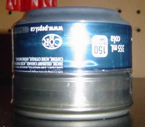 CUIDADOSAMENTE y con incluso la presión, puede fit que puede el extremo abierto del pop sobre el extremo abierto de la sopa... (Esto tomará paciencia)... y con cuidado, presione los dos juntos, como se muestra, hasta el borde de corte del aluminio puede conoce la ancha base de la lata. Cualquier adhesivo de la etiqueta sobra, o jarabe, hará este paso mucho más difícil. Asegúrese de latas están limpios antes de deslizarlos juntos.