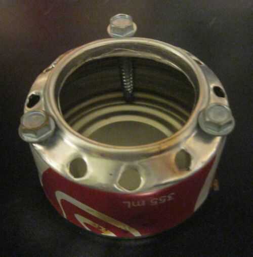 Aprovechando la fuerza y la forma de la sopa puede basar, usé tornillos y pernos para hacer un stand, atornillando, verticalmente, aunque los chorros y anclándolos cómodamente en/contra el externo o interno, anillo en la base de la sopa puede, producir un apoyo muy fuerte y seguro para macetas pesadas. Orificios individuales se podrían hacer para los pernos/tornillos, pero utiliza convenientemente del mismo diámetro que los jets en la estufa por lado en el momento. También convenientemente, eran la altura exacta requerida. Los pernos/tornillos también transferencia de calor hacia abajo en la cocina, ayudando a mantener los chorros a presión, hasta que se quema todo el combustible. Vea la foto. (Tornillos pueden también venir prácticos en el campo, para otros fines, más de un solo propósito estufa soporte.)