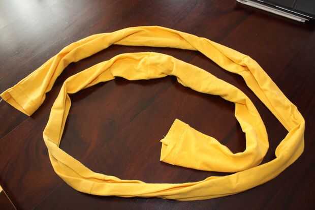 Si eres corto de ajuste, como estaba, acabo de cortar cuatro franjas rectangulares de tela de una camiseta amarilla y cosidos juntos longitudinalmente. Para acabado extra un poco, me cosió en un tubo largo luego convertía para ocultar las costuras. Esto no es necesario, ya que es difícil distinguir los bordes de la tela cuando está atado alrededor de la cintura.
