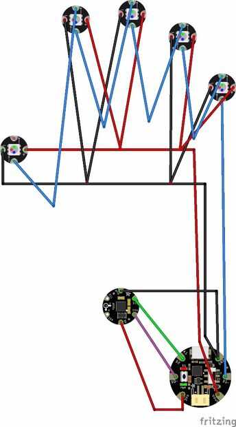 Me pareció más fácil al primer alambre las líneas de información en serie luego de la negativa entonces líneas de alta tensión en paralelo. Las líneas de alimentación desde el microcontrolador terminan en el "pulgar" NeoPixel, razón por la cual usted sólo necesita 16 en lugar de 20. Entonces usted quiere utilizar esas líneas de energía "pulgar" para todas las líneas de energía de NeoPixel otros de ejecutar para minimizar la cantidad de cables dentro del guante. Simplemente hice dos ranuras a lo largo de la circunferencia del alambre en la base de los dedos pinky/anillo y los dedos medio índice luego soldar los dos correspondientes a cables de dedo allí (ver la figura correspondiente). Luego cubrí estos puntos con el abrigo del encogimiento de la soldadura (recordar poner en antes de soldar), si no usas shrink wrap uso algún otro recubrimiento para evitar cortocircuitos en el circuito.
