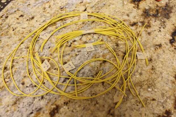 Usted querrá planear y cortar a todos sus cables, tira la última ⅛"- ¼", luego del paquete y etiquetarlos. Las medidas son específicas de la mano (con añadido margen para doblar y encajar), pero puede utilizar mis medidas a continuación para estimar y averiguar cuántas piezas para cortar: