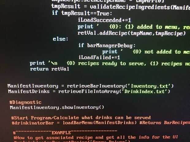 - Inventory.txt dice lo que son líquidos en qué bomba. Cuando las recetas carga barmanager crea un menú que consta de todas las recetas con ingredientes que se encuentran en inventory.txt. Este menú se utiliza para generar los botones de la pantalla táctil.