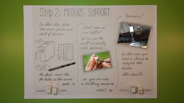 Taladro de las piezas de goma de borrar, para crear los soportes de los motores.