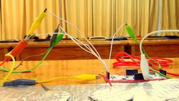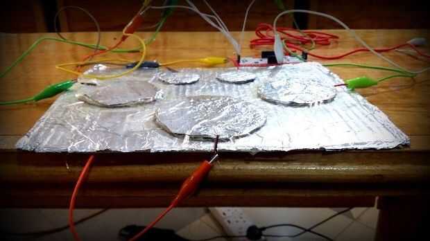 Corte un pedazo largo pero delgado de aluminio a veces alrededor de su muñeca como un brazalete. Conecte la pinza cocodrilo a la pulsera y su otro extremo a la barra de tierra en el makey makey.