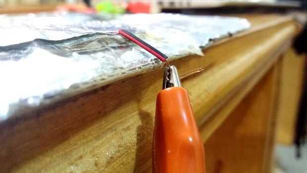 Corte los cables en piezas cortas con el conductor expuesto en los bordes de modo que los cocodrilos del paquete makey makey pueden "muerda". Utilice la cinta de cello para conectar el conductor expuesto de los cables en cada uno de los pads de la batería.