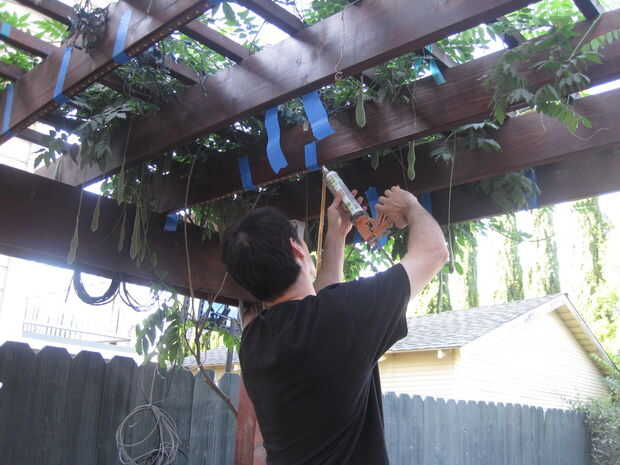 Establecer un cordón de silicona y luego colocar las tiras. Usted necesitará fijar con grapas o en mi caso, cinta de pintor, hasta que la silicona haya secado y endurecido.