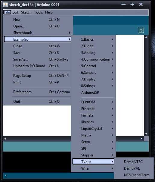 1. gracias a la buena gente en MIT, contamos con un ambiente amigable para trabajar con al programar un arduino para TV. Aquí está la Página de descarga. Por favor, descargue TVoutBeta1.zip, versiones anteriores no funcionará con mi programa.