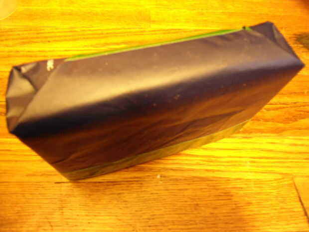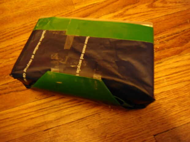Doblar el plástico en el fondo. Cinta el doblez hacia abajo hacia la parte "posterior" con cinta de embalaje. La cinta del conducto en la línea de doblez debe cubrir cualquier plástico desnudo. Mantenga la tapa en su lugar con cinta de embalaje.