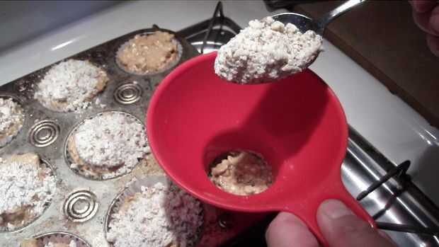 Un embudo limpio se puede utilizar para agregar un ingrediente seco (streusel de nuez se muestra aquí) o fruta.