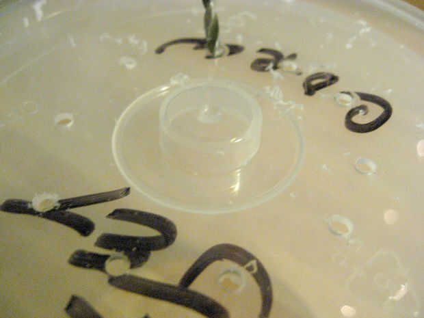 Hacer varios agujeros (al menos 6) en el fondo de la olla superior. Se trata de la olla que contiene la planta. Usé una Dremel con una broca de 1/8 bits. Los orificios permiten el exceso de agua drene de la parte inferior para que no te la pudrición de la raíz.