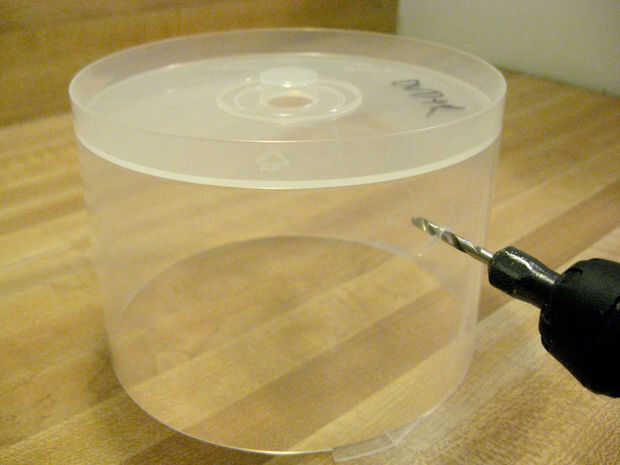El exceso de agua de la olla superior tiene que ir a algún lugar y probablemente no desea en el piso. Invierta el tambor de CD así que es como un tazón de fuente. Hacer 4 agujeros en el recipiente inferior en los lados sobre una media pulgada (2cm para el resto del mundo) desde la parte inferior. Espacio les hacia fuera alrededor de la circunferencia.