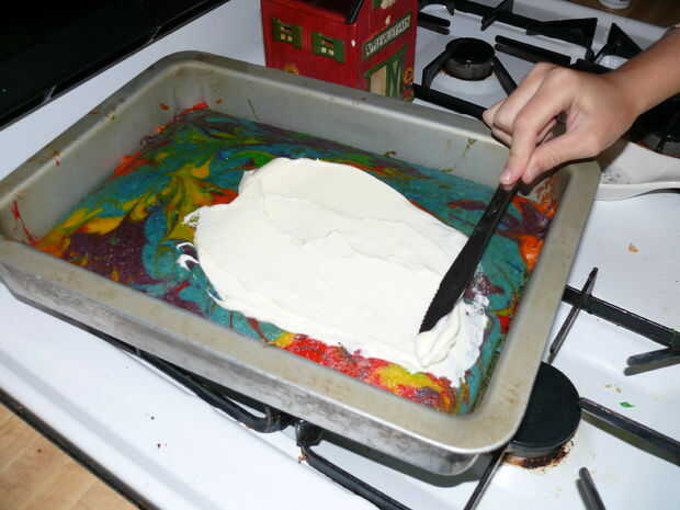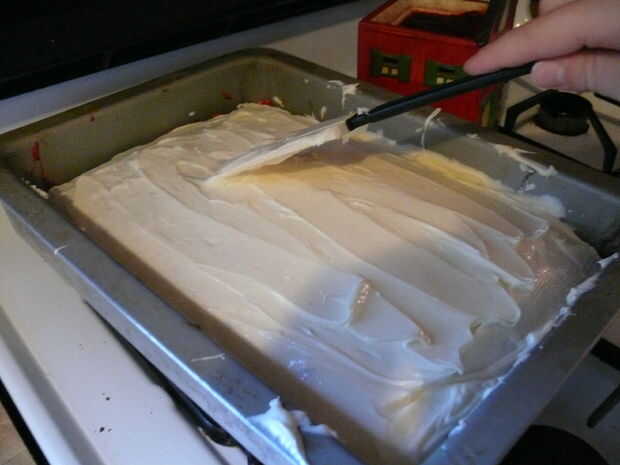 Helar tu pastel en opcional, pero creo que sabe mejor con escarcha. Una vez que el pastel se haya enfriado, vierta el glaseado sobre el pastel. Usando un cuchillo de mantequilla, Esparza uniformemente el glaseado sobre el pastel. Suavizar el glaseado. Puede colorear el glaseado es quiero.