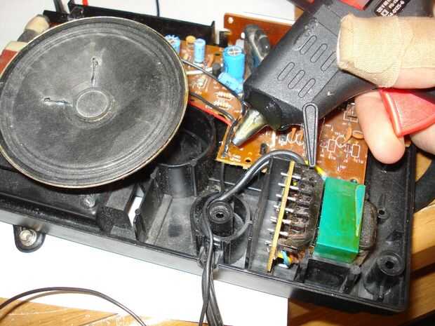 Asegúrese de alivio el cable la tensión para que no se romperá en la soldadura conjunta si obtiene tiró en. Yo simplemente caliente había pegado a la placa en el reloj.
