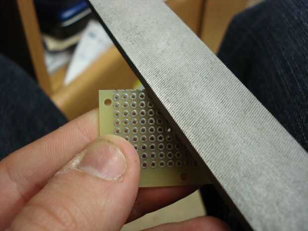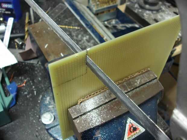 Una sierra para metales y vice pueden hacer este trabajo bien si no tienes acceso a una sierra de cinta o similares. Asegúrese de poner algún cartón entre el material y la prensa para evitar que las mordazas del escopleo con gubia de la placa de circuito.
