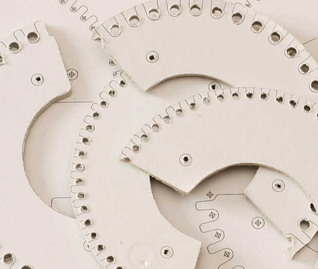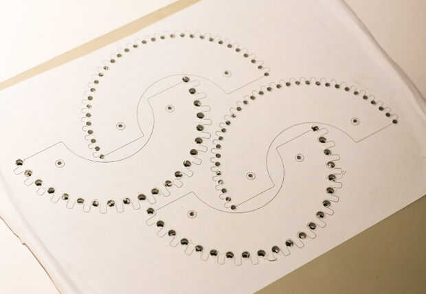 Les dejo el pdf con los esquemas de los engranajes, aunque están hechos para las dimensiones exactas de mi dispositivo, y usted necesita quizá para hacerlos diferentes. He pegado la hoja impresa en el plástico a la forma a seguir.
