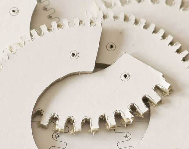 Ahora que llega el momento en que deseé tener una impresora 3D o un cortador CNC con todo mi corazón! De hecho no pude corté los engranajes con una sierra de vaivén motorizado, porque la fricción había fundido a la lámina de plástico. Yo pude han usado madera, pero los dientes son muy estrechos y me ha gustado mucho este material de plástico que tenía (creo que fue la portada de un scanner o algo similar), pensé que era fácil de cortar con la mano. De hecho fue, pero de todos modos el proceso ha sido tan largo.