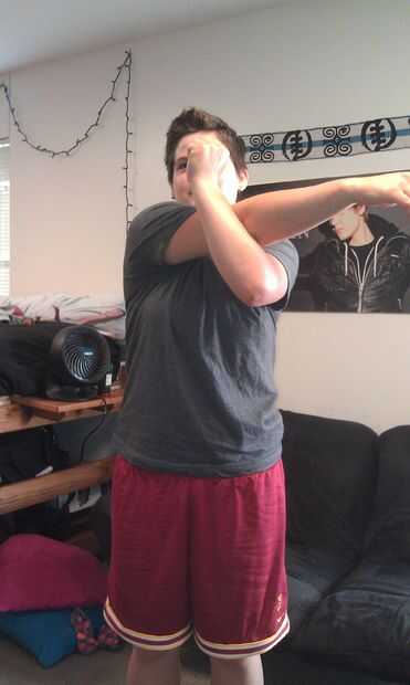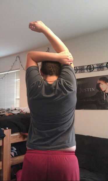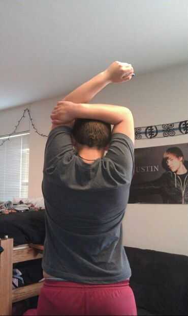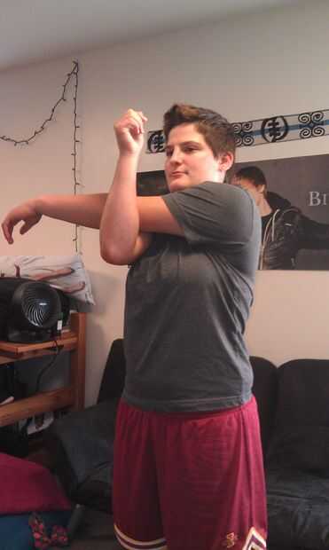 > Su mano izquierda y tire de su brazo derecho hacia la cabeza.