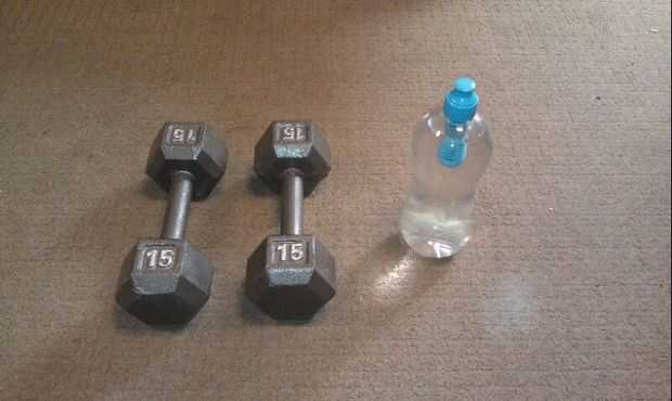 En primer lugar, obtener una botella de agua completa para crear una marca cambio de peso o utilizar un peso de su propio si está disponible.