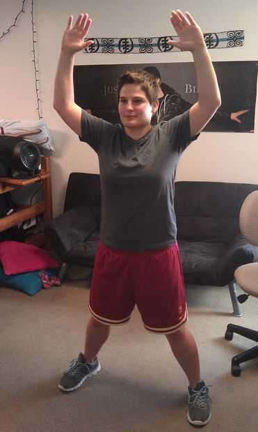 -Salto en el aire y separó sus piernas y llevar los brazos sobre su cabeza.