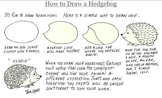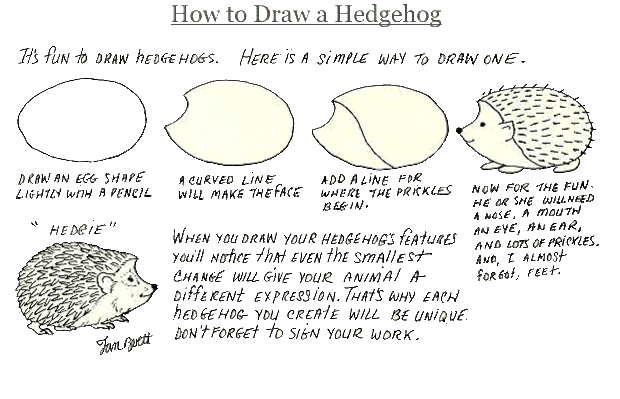 Encontré un excelente pequeño tutorial sobre "Cómo a dibujar un erizo" en la Página Web de Jan Brett. Vale la pena explorar el sitio de Ms Brett, para todas las clases de dibujo y actividades de arte, así como su gama de libros para niños.