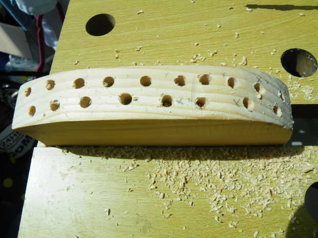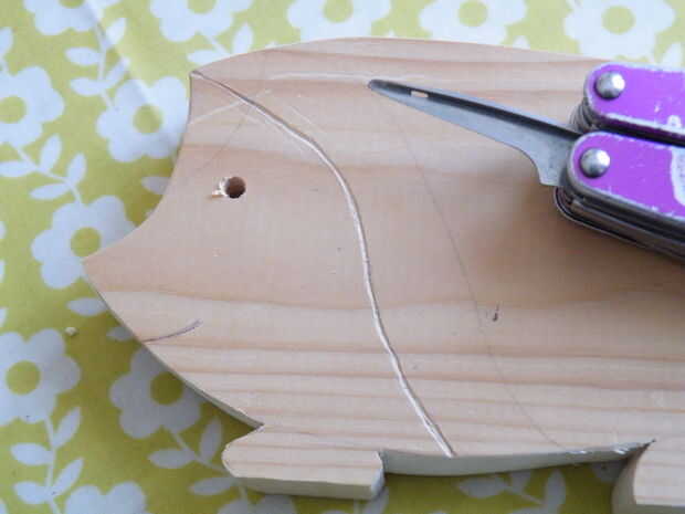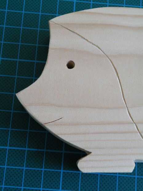 He añadido un ojo por la derecha a través de la perforación, y la boca es un solo corte en la Sierra de calar. La línea que separa la cabeza del cuerpo es una muesca poco profunda, que presiona en la madera con el punzón en mi Leatherman.