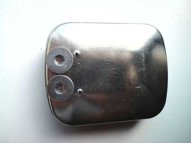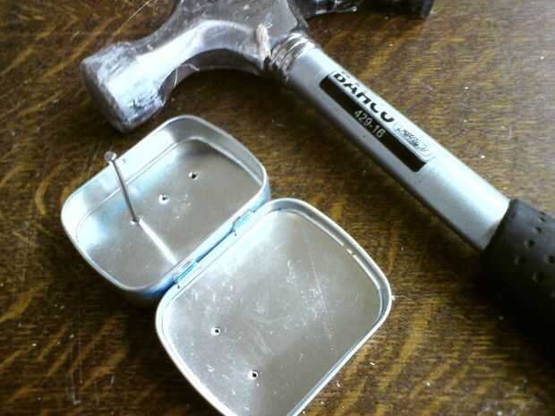 Use un martillo y un clavo para hacer los ocho agujeros: dos en la tapa para antenas, seis en la parte inferior de las piernas. Como se puede ver la mina no están muy bien colocados y algo asimétrico, pero eso está bien, no se mostrará.
