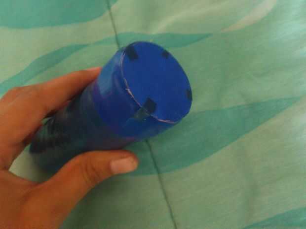 Luego, usé cinta aislante azul para hacer la empuñadura. Usé un pedazo de cartulina y pegado en la parte inferior para completar el mango. Decidí hacer todo azul. Por lo tanto, pinté la cartulina azul.