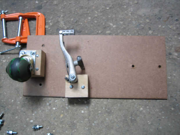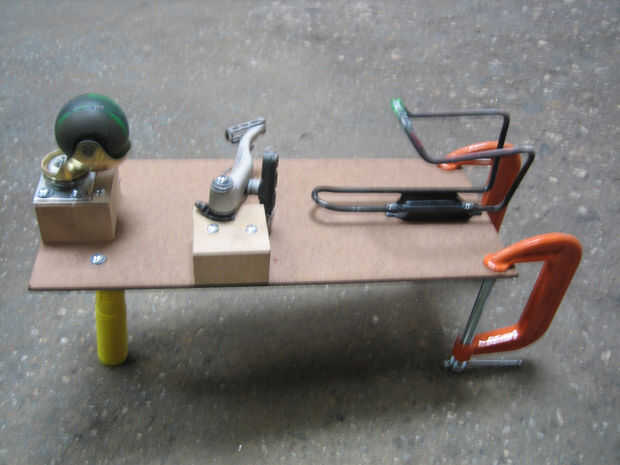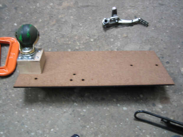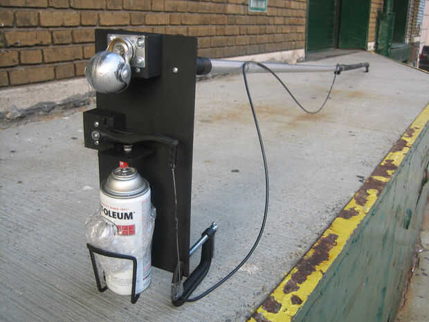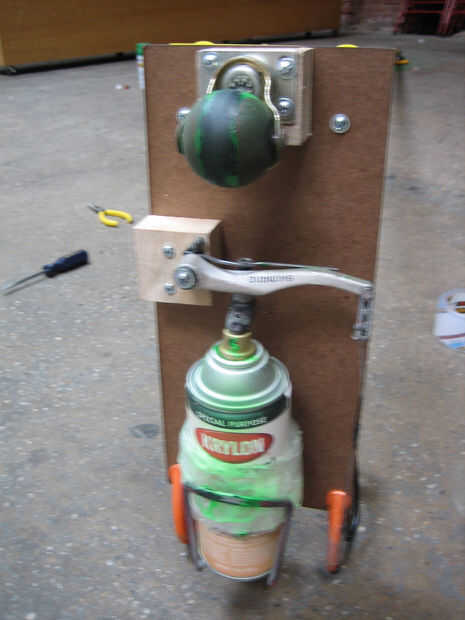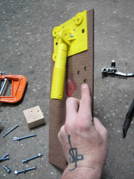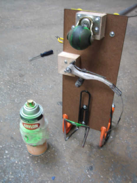 Use los tornillos #8-32 y tuercas, arandelas en su caso fijar las canalizaciones verticales, accesorio de bordeadora, brazo del freno y sostenedor de botella de agua. Si tu botella de agua no se alinean con los orificios genéricos de la plantilla deberás experimentar con la ubicación de la botella una vez que se monta el resto de la cabeza. Puede dejar la zapata real sobre el uso del brazo como el contacto del punto con la tapa de la lata de aerosol, o usted puede hacer su propia superficie de contacto como lo hicimos con un trozo de 2 pulgadas x 2 pulgadas de 1/4 de pulgada Plexiglas. Compruebe las imágenes adjuntas y las notas de la foto para información más específica.