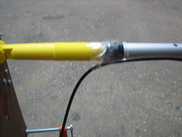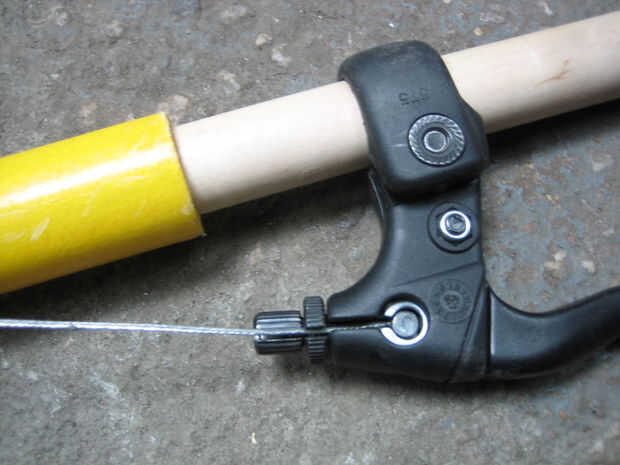 2. para hacer la palanca que controla el aerosol puede remotamente, simplemente necesita Deslice la palanca de la bicicleta sobre la base de la vara de extensión y conectar el cable de bicicleta a la palanca de mano utilizando la función de retención redondo en el extremo del cable. Si está usando un poste de diámetro más pequeño, menos de 1 pulgada, esto no será un problema. Para aquellos que utilizan grandes postes de diámetro (1" diámetro o más grande), usted necesitará modificar el polo. He modificado mi polo de pintores Sr. Long Arm, quitando el apretón de goma al final. Esto revela una cavidad hueco dentro del polo. Me ajustaron a una conexión roscada dentro de esta cavidad interna y atornillado en una sección de corte de poste de extensión 0,90 pulgadas de diámetro. La palanca de mano se desliza fácilmente sobre esta pequeña sección del poste de la extensión.