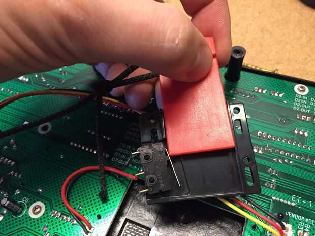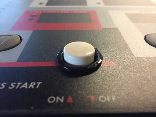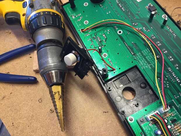 Después he conectado el pulsador SPST en / Presione el botón que va a ser mi nuevo botón de encendido. Probada, buena. Montara el botón a la bandeja de la tarjeta roja que se encuentra debajo del panel de control para que no se pegue tan alto. También taladrar un agujero en el panel de control hasta la parte superior e instalado un buje en el orificio para limpiar la mirada.