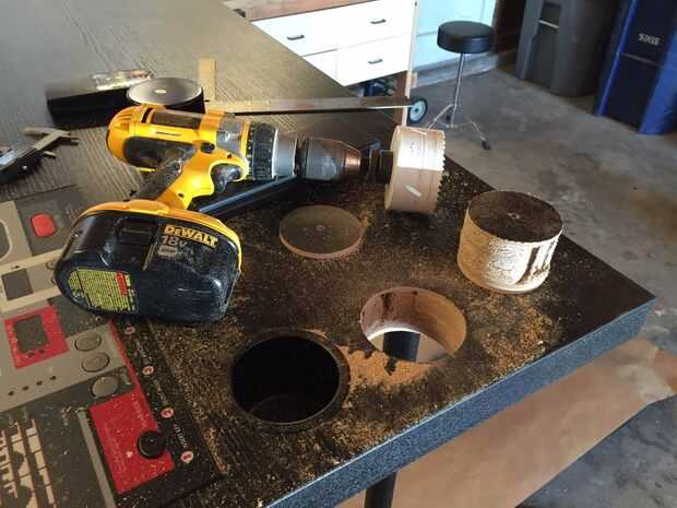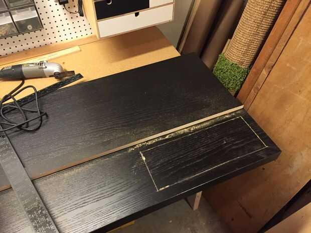 Ahora estoy cortando un agujero en el tablero de la mesa para el panel de control. El panel de control tiene una 1/8" labio saliente alrededor de él, lo que significa que se cuelgue en un agujero si es apenas el tamaño correcto. Demasiado pequeño, y no cabe. Demasiado grande, y vas a caer a través de! El margen de error fue apretado, lo midió y dibujó el agujero para cortar con mucho cuidado. Cortan con un cortador de inmersión. Retirar la chapa superior reveló 4" a cada lado para ser madera sólida (tablero de partícula). Corte a través de ella no era divertido, pero es factible. Yo podría haber lo evitó e instalado el panel de control 4 + pulgadas desde el lado pero quería más de lo más lejos posible.