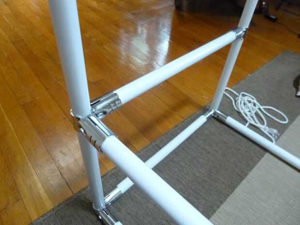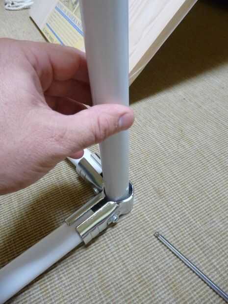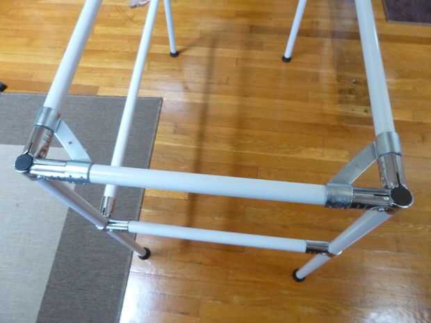 Voltee el marco y montar el resto de"pie" como se ve en las fotos. Se hace de 2 pipas de G1 de 18,5 pulgadas y una 35 pulgadas G1 tubo, dos L-juntas y uniones de los dos extremos. Te sugiero que no hagas las articulaciones demasiado apretado en el primer lugar en caso que desee subir o bajar más tarde.