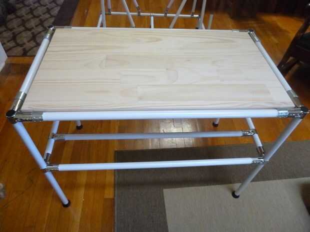 Coloque las piezas en el piso y empezar a construir el escritorio boca abajo como se muestra en la imagen, para conseguir el marco básico junto. Algunas veces ayuda Instale una articulación parcialmente y luego simplemente deslice los tubos se. Ponga las tapas en la parte superior de los 4 tubos vertical de la pierna y los pies de goma en los fondos.