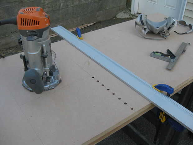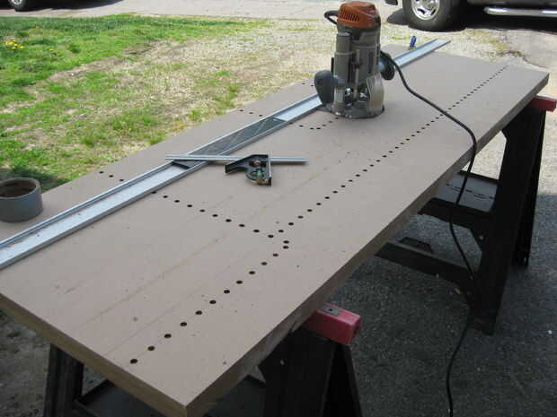 He presentado mis líneas y agujeros, de establecer un carril de guía y luego utilizar mi router de penetración para hacer los agujeros.