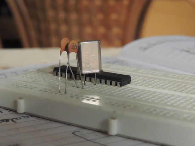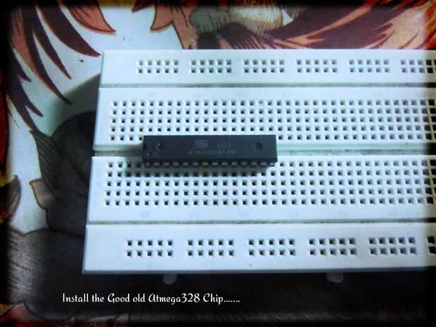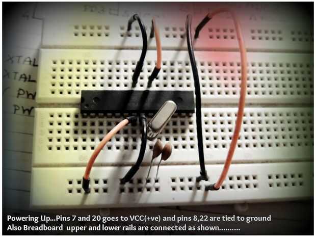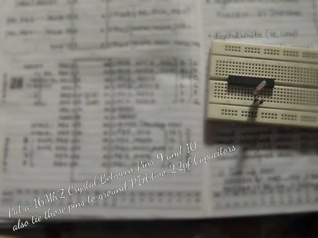 Había enchufado el Atmega328/168 de la protoboard y une los cristales requiere, entonces conectar las líneas de alimentación a it...see las fotos...