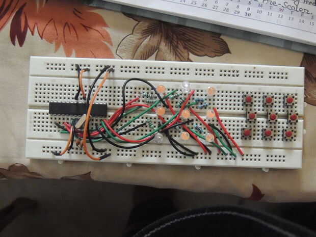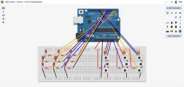 En el diagrama del circuito estoy conectando la Junta a un Arduino, circuitos 123D causa no admite agregar IC microcontrolador a la placa. Creo que debe añadir que pronto. Lo que me gusta más de la página web es "Simulación". Es realmente divertido ver los LEDs parpadean, interruptores siendo presionados, sin siquiera tocar el soldador. Y sí, usted puede también aún el código allí... Ese sitio web es awsum.