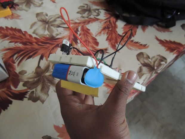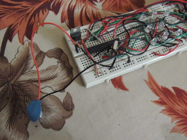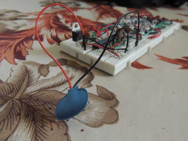 y por último la junta con una batería de 9V regulada mediante una regulador de voltaje 7805 IC (acompañado de dos 0.1uF tapas)