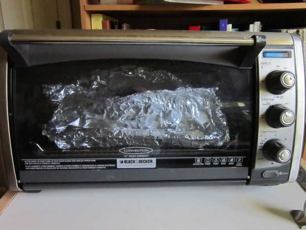 Utilice una bandeja que está cubierta en papel de aluminio y también tiene papel en la parte superior también. Usted no quiere el papel tocando mientras se cocina su creación. Quiere un espacio entre la lámina superior y la arcilla. Sólo puede levantarse en la bandeja y dejarlo cocinar de esa manera.