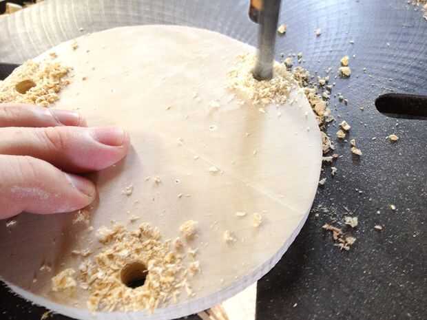 Cortar tres círculos de cinco pulgadas y media de la misma 1/2" madera contrachapada que utilizaste para el engranaje interno. Perfore tres agujeros en cada una, uniformemente espaciadas alrededor del círculo y aproximadamente 1/2" en el borde. Hay una plantilla PDF para esto para que sea más fácil.