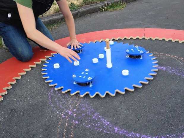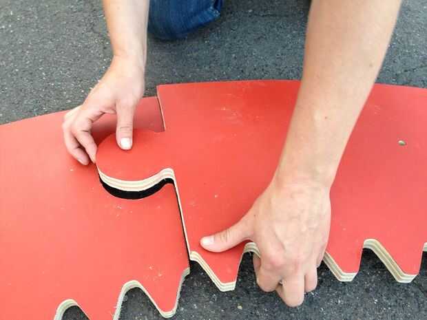 Para utilizar tu espirógrafo gigante, encontrar un pedazo liso de asfalto u hormigón y colocar los segmentos del anillo exterior.