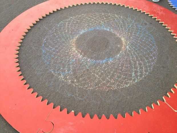Cambiar colores de tiza y ubicaciones y combinar engranajes para hacer patrones. Incluso uno de los engranajes más pequeños alrededor de un engranaje mayor, puede rodar sin usar el anillo exterior en absoluto.