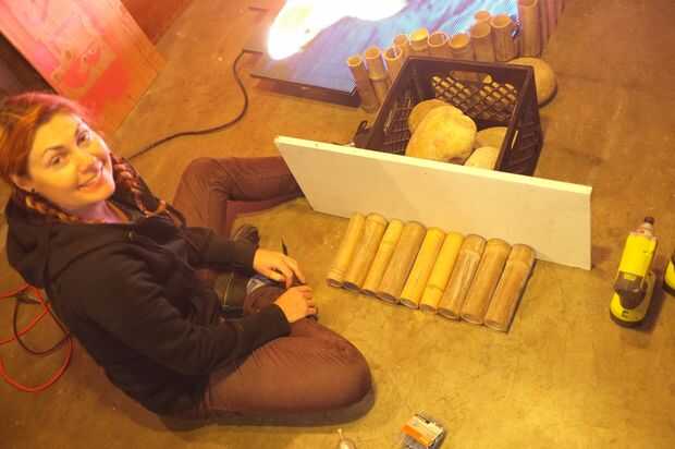 Con alrededor de 70 pies de bambú en el remolque de la cuenta de Craigslist, nosotros fijó aparte picar en 8" piezas para construir una cerca alrededor de la pieza. Erin hizo una plantilla para alinear las piezas que nos permiten una superficie inferior plana, y Galen pre-perforados los agujeros para evitar rajaduras el bambú y una tira de listón largo para hacer una sección de cerca premontado a Nestlé contra el lado del estanque. Unas piedras bien colocadas fácilmente celebrará esta Asamblea en el lugar.