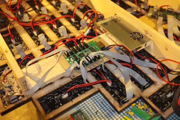 Ahora que hemos tenido cada panel encendido y probablemente hablando entre sí, ya era hora algunos flujo de datos de pixel y probarlo. Usé algunos cables más largos de la cinta de 16pos a la cabeza de cada horizontal empastarían nuevo para la tarjeta eje y puente algunos de los paneles de la extraña orientación de alambre.