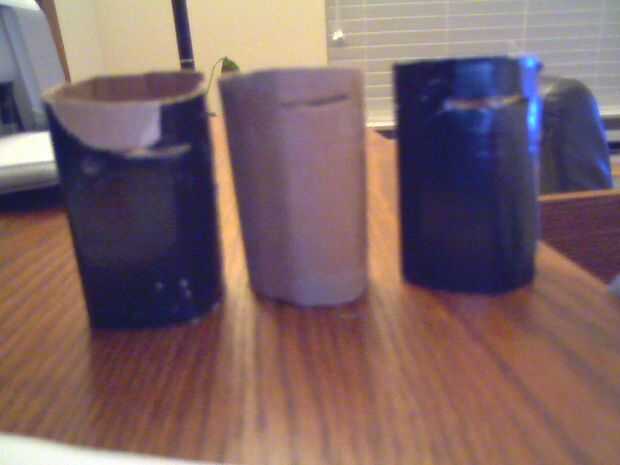 Luego corte las aberturas a través de ellos en la parte superior de los cilindros. 2 tramos cortados deben ser unos 2cm y el otro debe ser unos 3cm de largo.