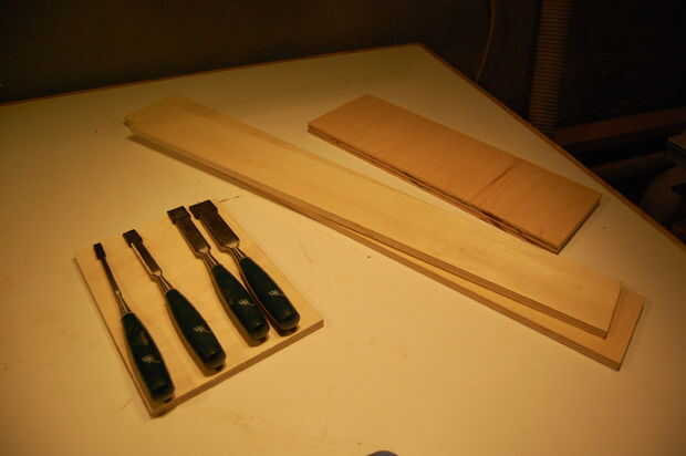 Espaciados los cinceles por el ojo y me marcó sus centros en los soportes inferior y superior. Esas marcas luego fueron ampliadas para mostrar los centros de mis agujeros. Quería que los centros a ser 3/4" en desde el borde trasero y lo recorte el borde delantero después de Asamblea. Para ello, utilicé una herramienta de la marca de la tienda hizo. Tengo 5 de diferentes profundidades (1/4", 1/2", 5/8", 3/4" y 1") y fueron hechos con chatarra álamo, 1/4" plexiglás y algunos tornillos.