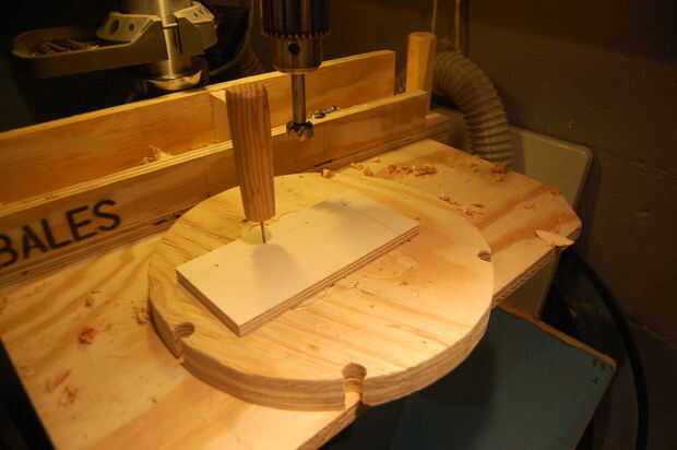 Empecé los puntos centrales con mi tienda hecha a punzón, que ayuda en la alineación de los pedacitos de taladro. Luego se perforaron los cuatro orificios con una broca de 1" forstner.